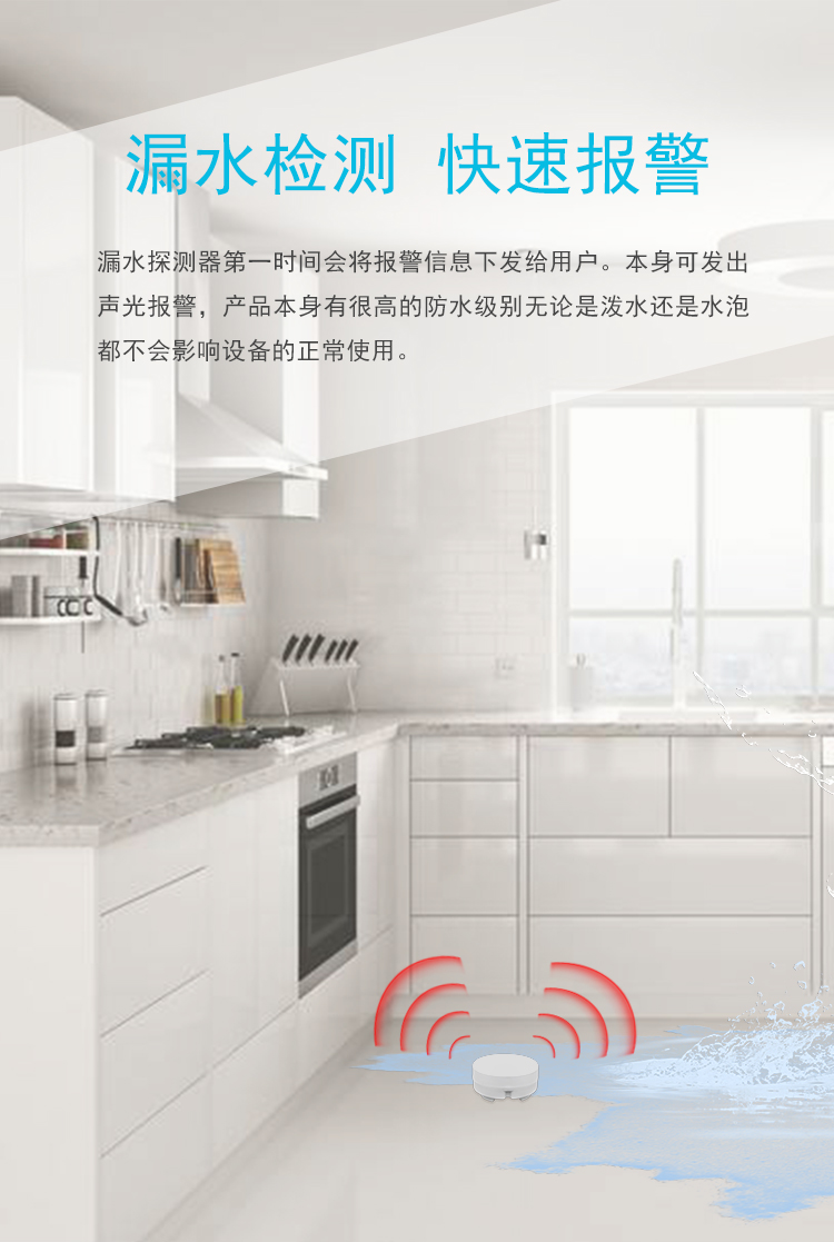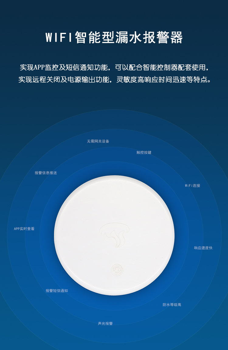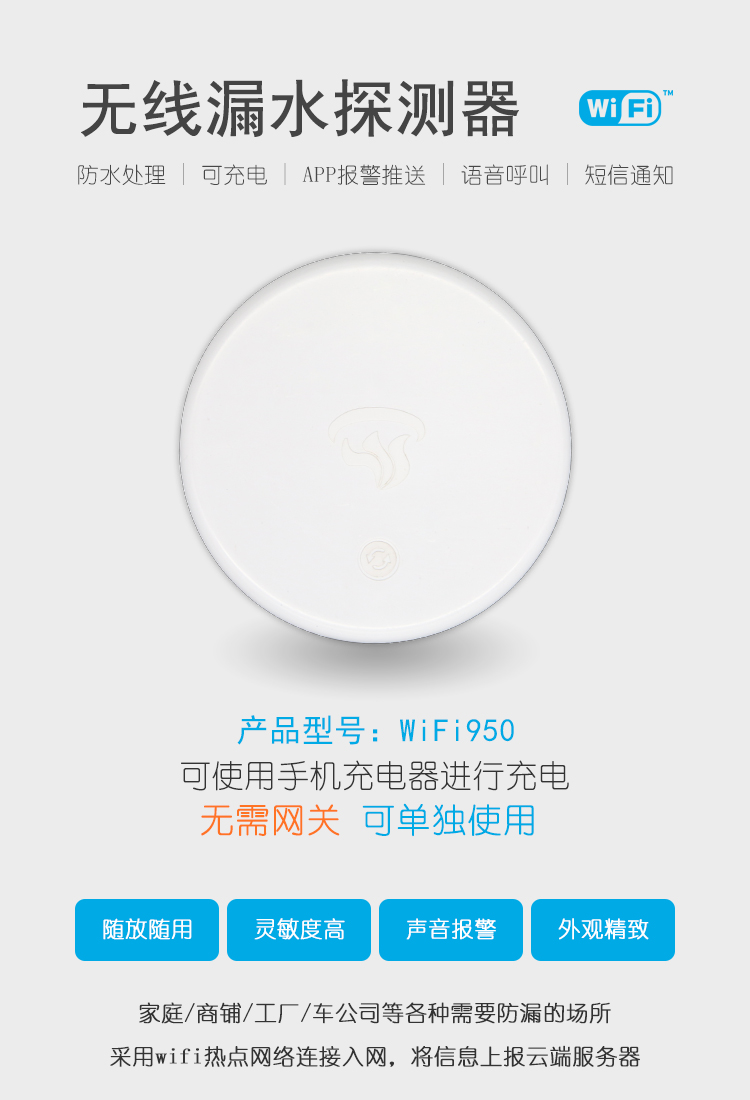 产品描述:本款WIFI型无线漏水探测报警器,防水等级达到IP67,可在5米深水下正常工作。采用家用无线网络传输方式,触控操作,可充电,可远程发送报警数据到手机APP,报警信息到手机,语音报警灯功能