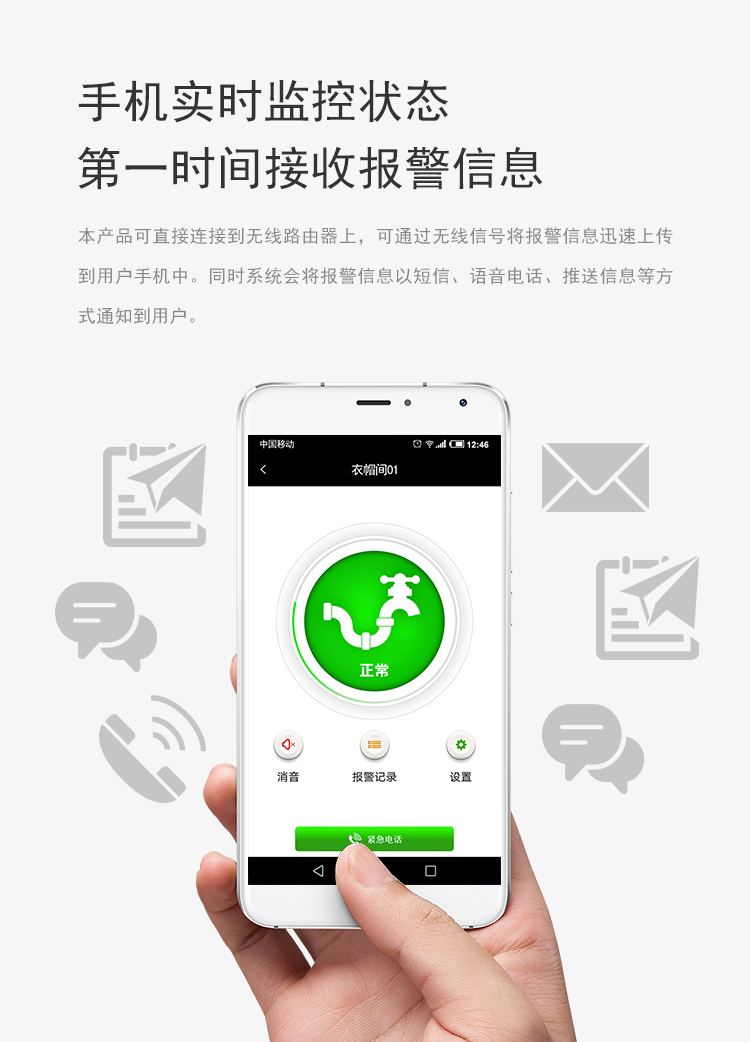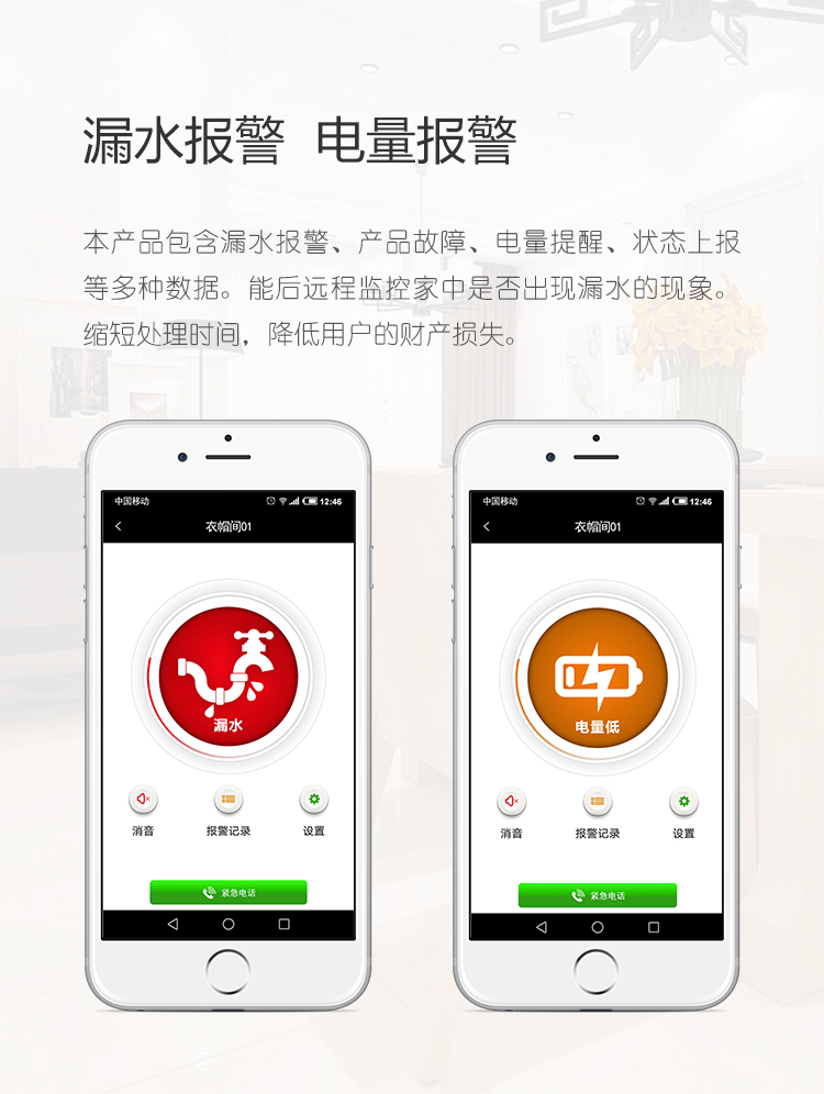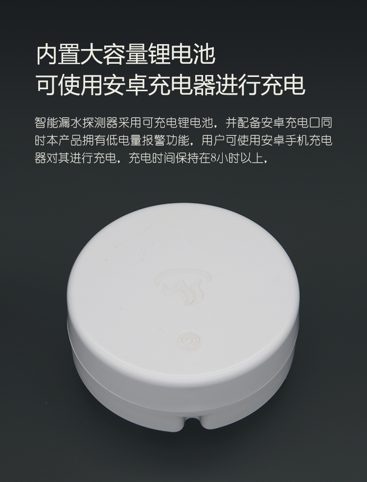 本款WIFI型无线漏水探测报警器,防水等级达到IP67,可在5米深水下正常工作。采用家用无线网络传输方式,触控操作,可充电,可远程发送报警数据到手机APP,报警信息到手机,语音报警灯功能。