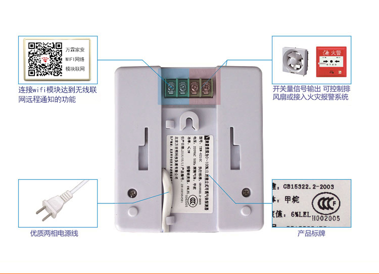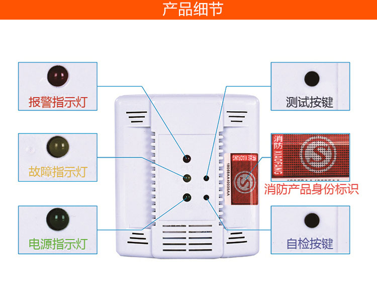 产品描述:本探测器具有以下特点:采用半导体式传感器,具有检测灵敏高,性能稳定,使用寿命长等特点;采用220VAC电源供电,即插即用,方便可靠;采用高亮LED发光二极管指示报警信息,报警声光高。